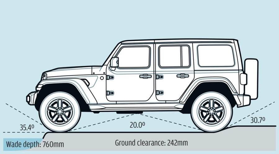 حتی اگر رانگلر را در تریم go-absolutely-anywhere نخرید، آفرودر remarkably capable است. در هر guise آن مرسدس G-Class و تویوتا لندکروزر را برای حداکثر عمق wading و فاصله از زمین میزند، و across the board روی زوایای clearance. یک لندروور دیسکاوری از آب عمیقتر ford خواهد کرد و فاصله از زمین بیشتری دارد، اما حتی آن نمیتواند زوایای ورود و خروج جیپ را match کند.