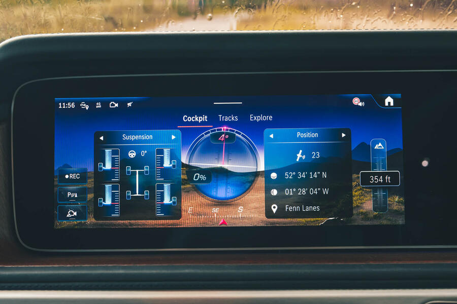 در جاهای دیگر، دکمه بزرگ مرکزی داشبورد را فشار دهید و نمایشگر به gauges خارج جاده خودرو shortcut می کند، که شامل inclinometer، articulation axle واقعی زمان و تقسیم drive بین هر چهار چرخ است.