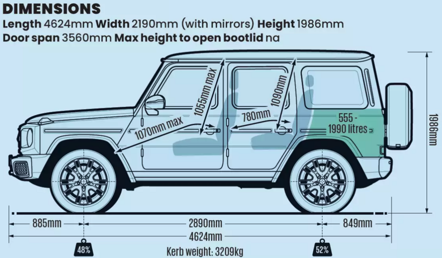 صندوق نسبتا کم عمق، با 555 لیتر، کمی کمتر از مدل های G کلاس ICE به دلیل کف کمی بلندتر است، اما صندلی های عقب صاف تا می شوند. این، همراه با سقف بسیار بلند، G کلاس را به اندازه هر SUV senior دیگری جادار می کند.