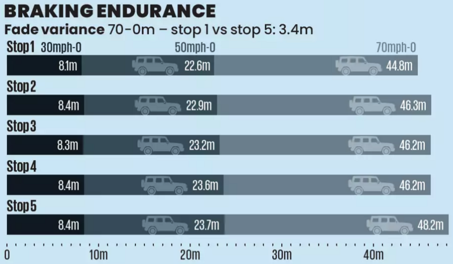 در واقع، باید به عملکرد ترمز mention ویژه داد. خودرو تست ما Falkens spec تابستانی می پوشید، و در حالی که توقف های repeated fade آورد، 45m یا so که معمولا G580 سه تنی از 70mph طول می کشد خیلی creditable است. شبیه به نحوه عملکرد Range Rover Sport SV است.